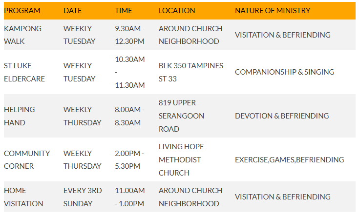 KAMPONG WALKWEEKLY TUESDAY9.30AM - 12.30PMAROUND CHURCH NEIGHBORHOODVISITATION & BEFRIENDING